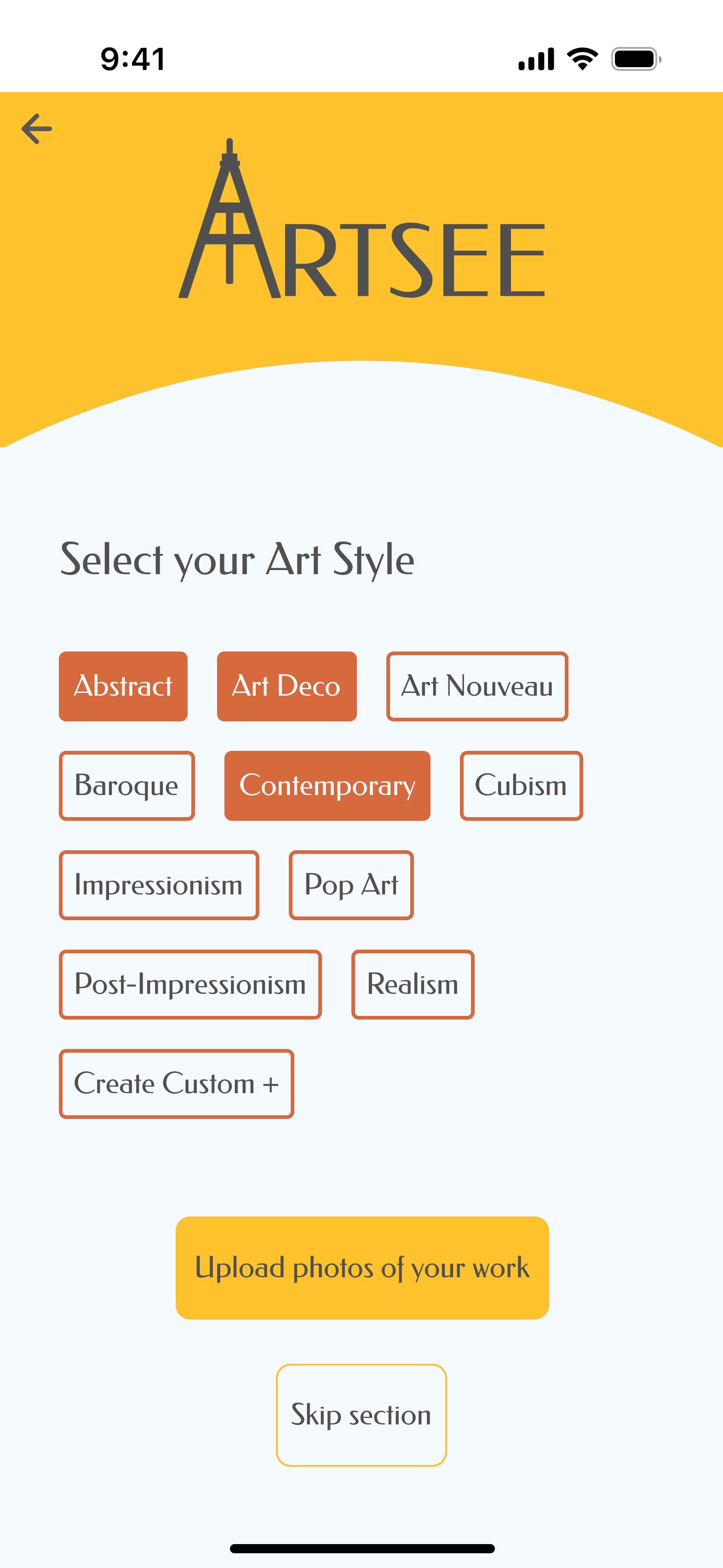After conducting usability testing on my wireframes, I wanted to get an insight on how the artists wanted the app and overall brand to feel. Once of the questions I asked was "if you had to describe yourself using a colour, what would it be?" Interestingly, 5 out of 6 participants answered with the colour yellow. The remaining participant answered with "orange or peach".