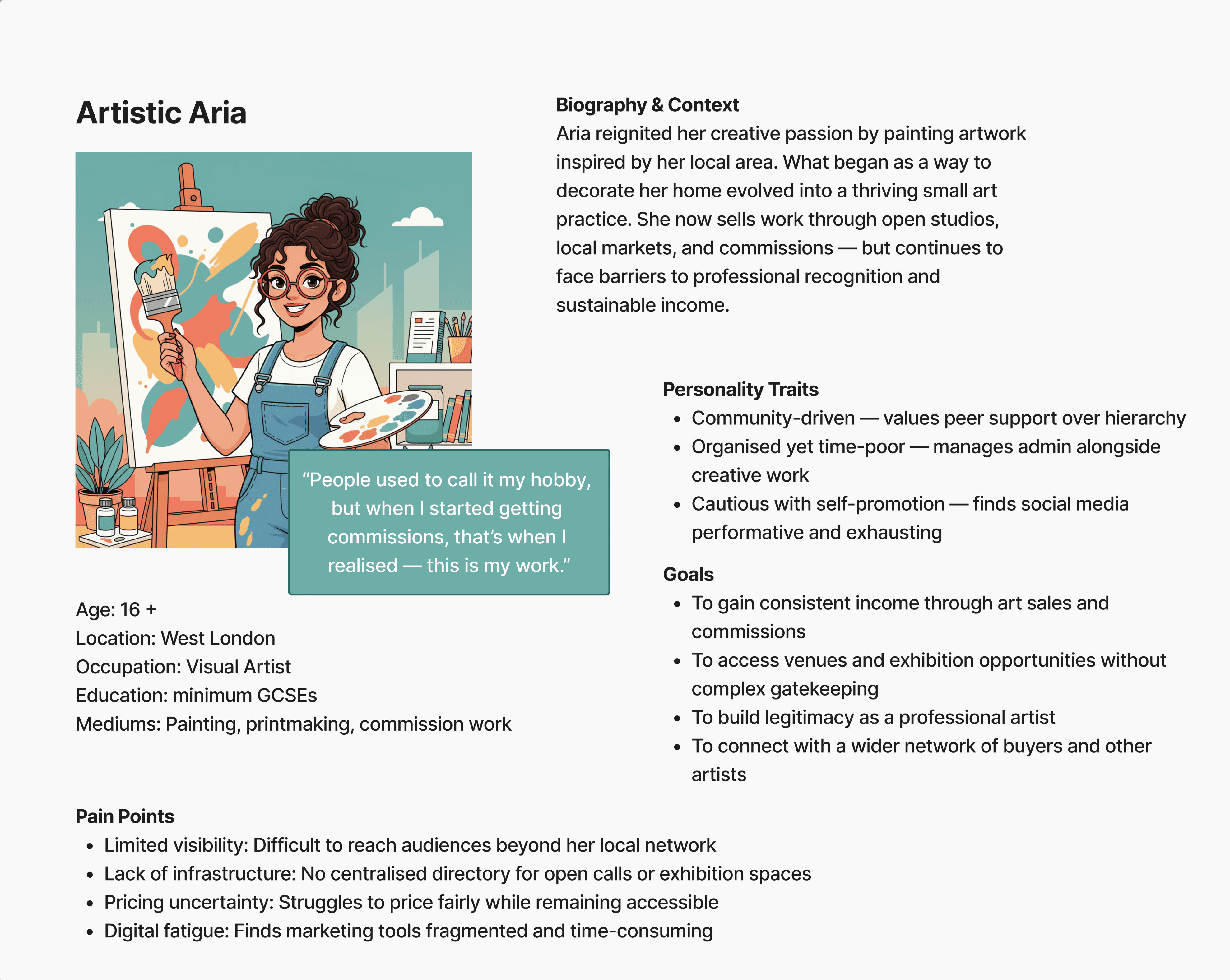 While chatting with a friend who’s a local artist, I started thinking about how hard it can be to get work seen or sold. As I spent more time looking into the art world, I started to notice how galleries and exhibitions often feel a bit closed off, with limited clarity around selection, pricing, or what opportunities are actually available. For me, that lack of transparency seems to make it harder than it needs to be for artists to find fair, accessible ways into the art market.