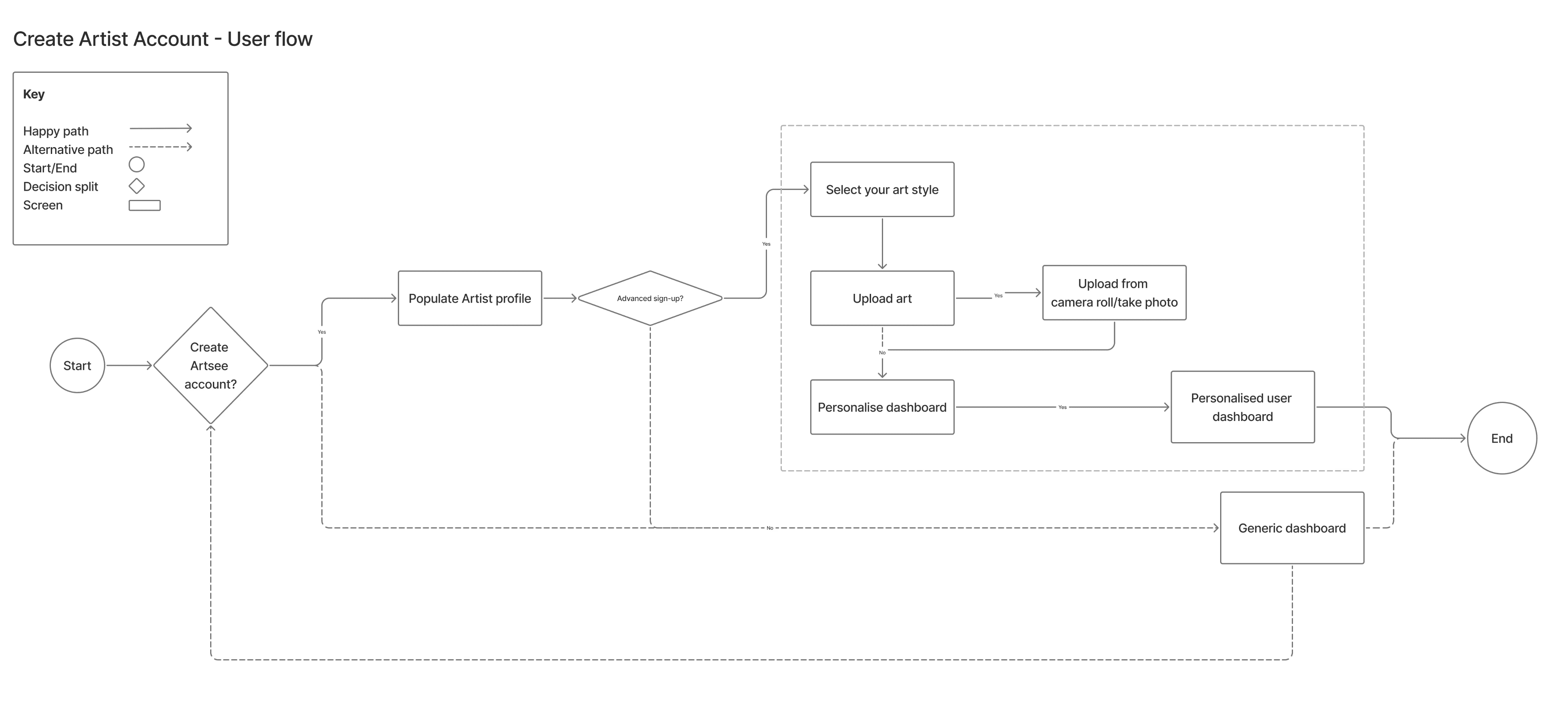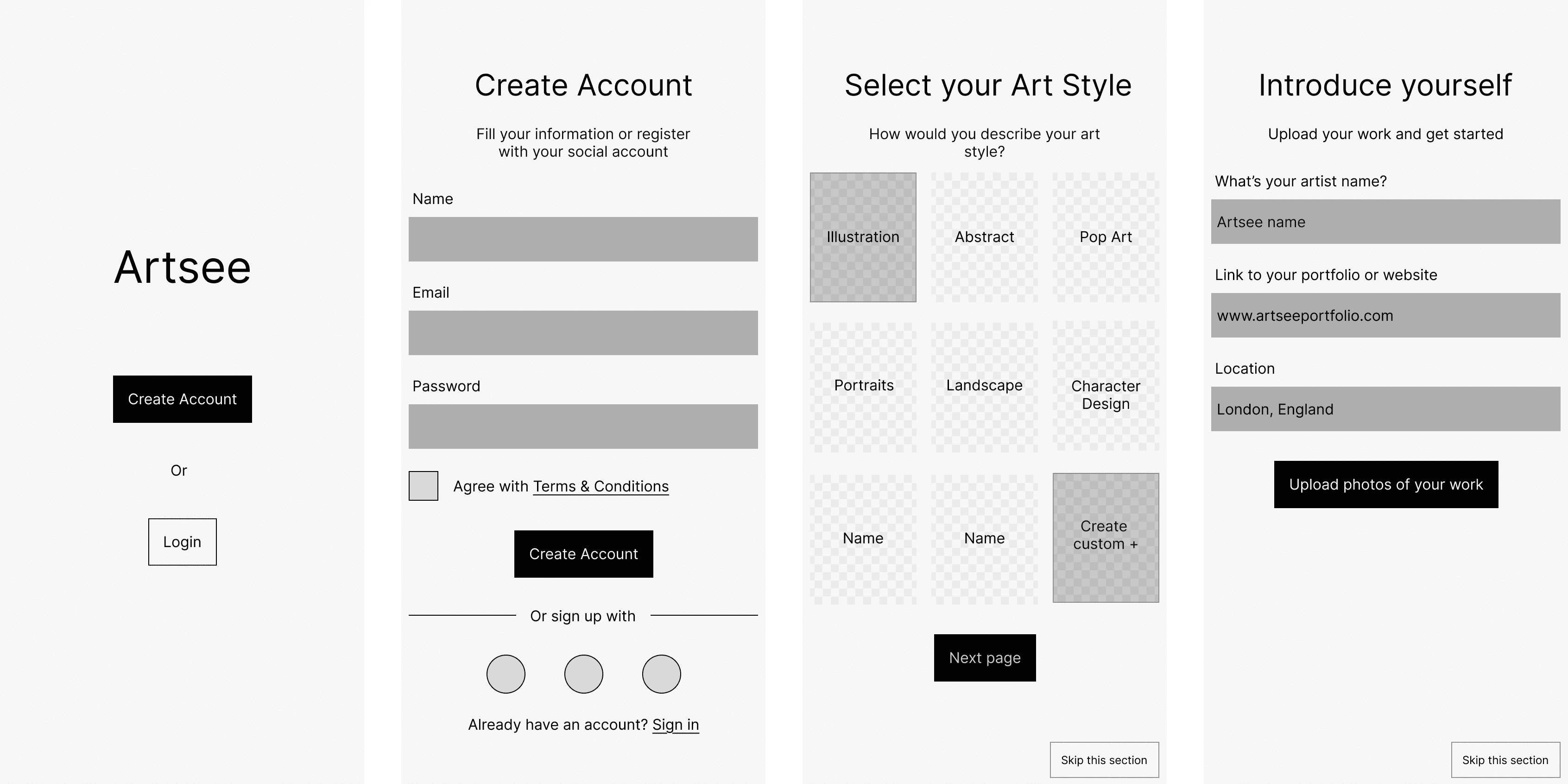 During my interviews with the artists, I found a mix of preferences during the onboarding process. This is the artists' first impression of the app and I found that many mentioned wanting to test run and browse the app before creating account. With this in mind, I came up with 3 paths.
