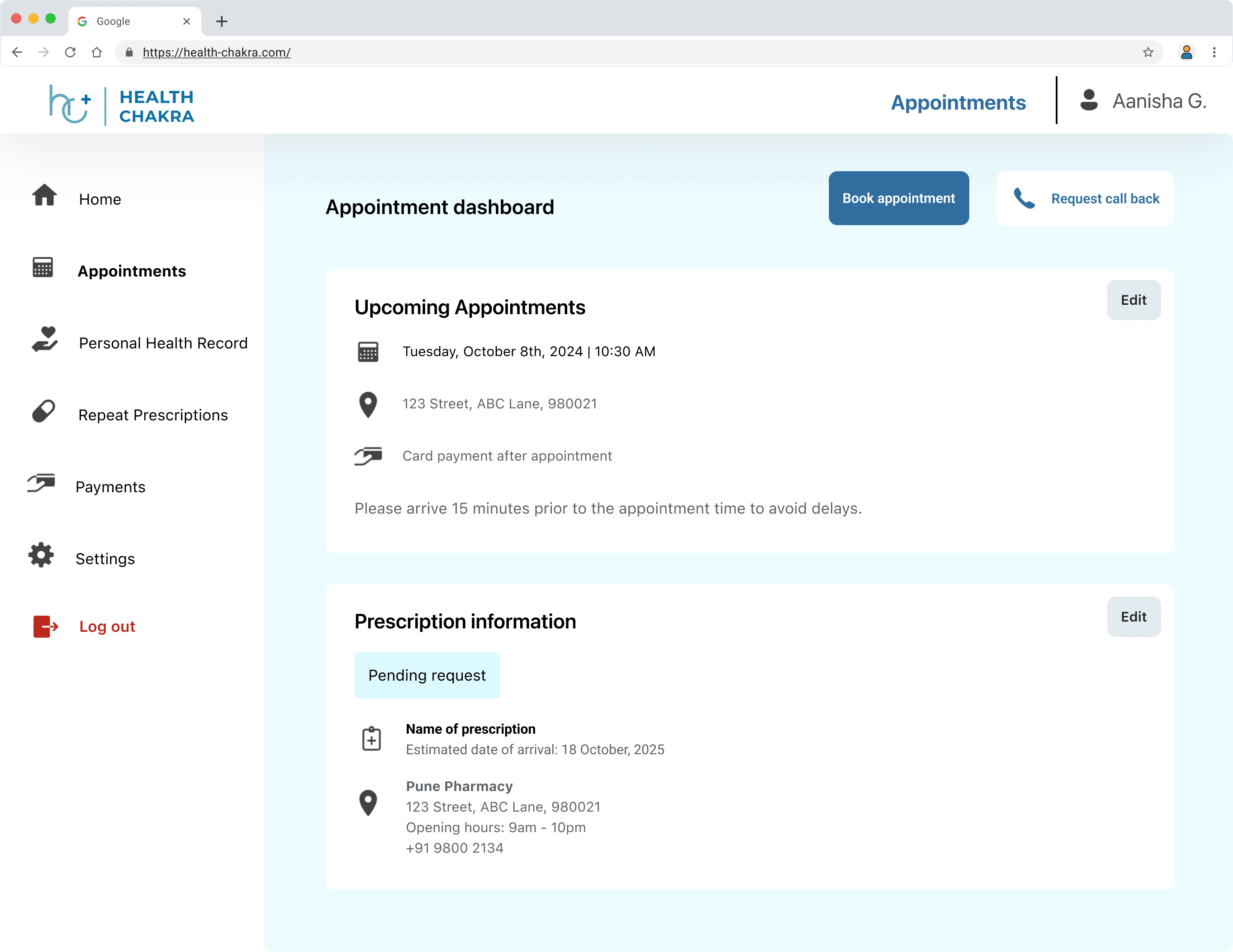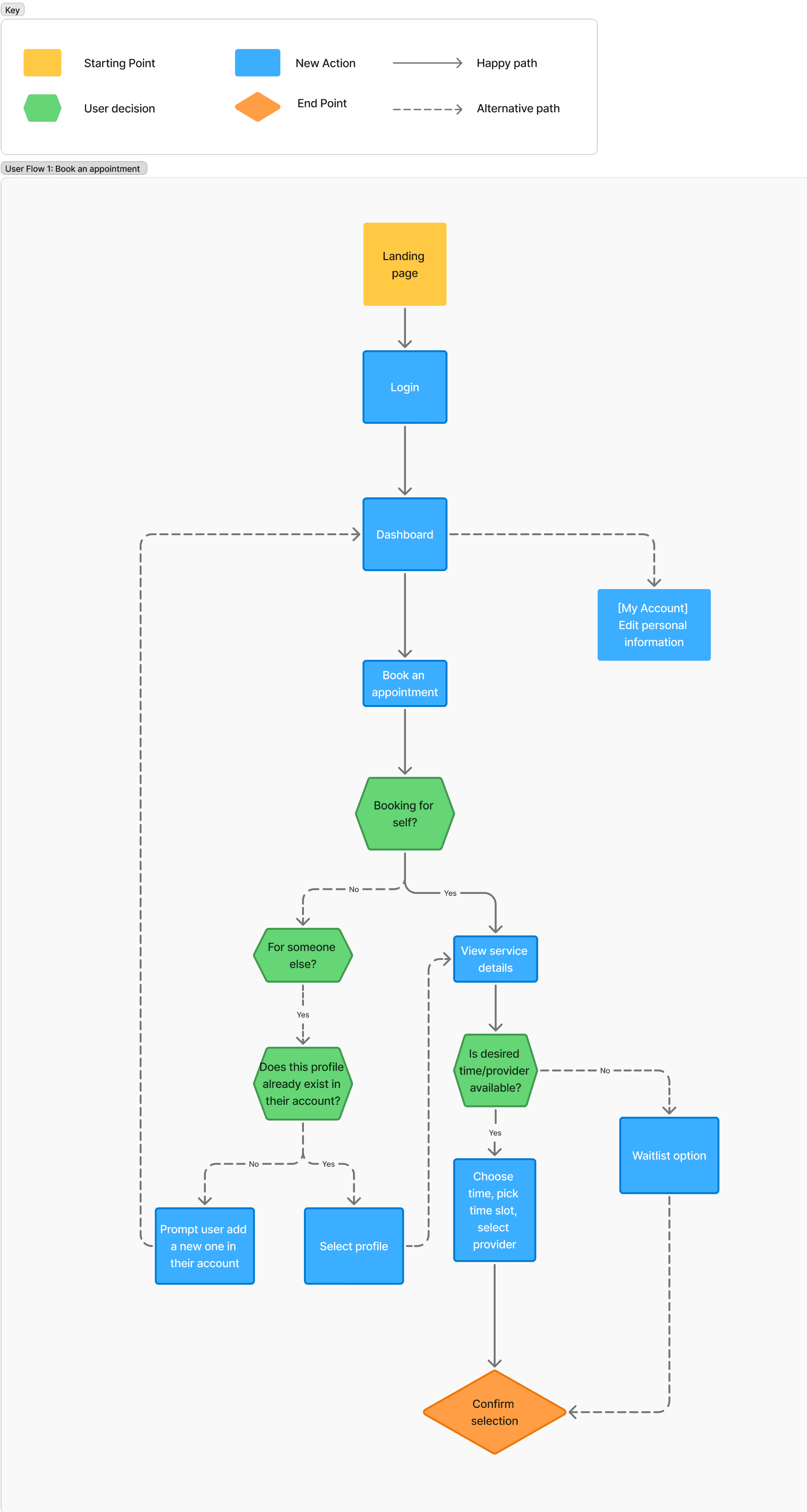I designed the user flow to take the experience a step beyond the original business requirements. During the interviews, I kept hearing the same issues: users struggled to book appointments, ran into technical glitches with the information shown, and often had to call the clinic to get things done.