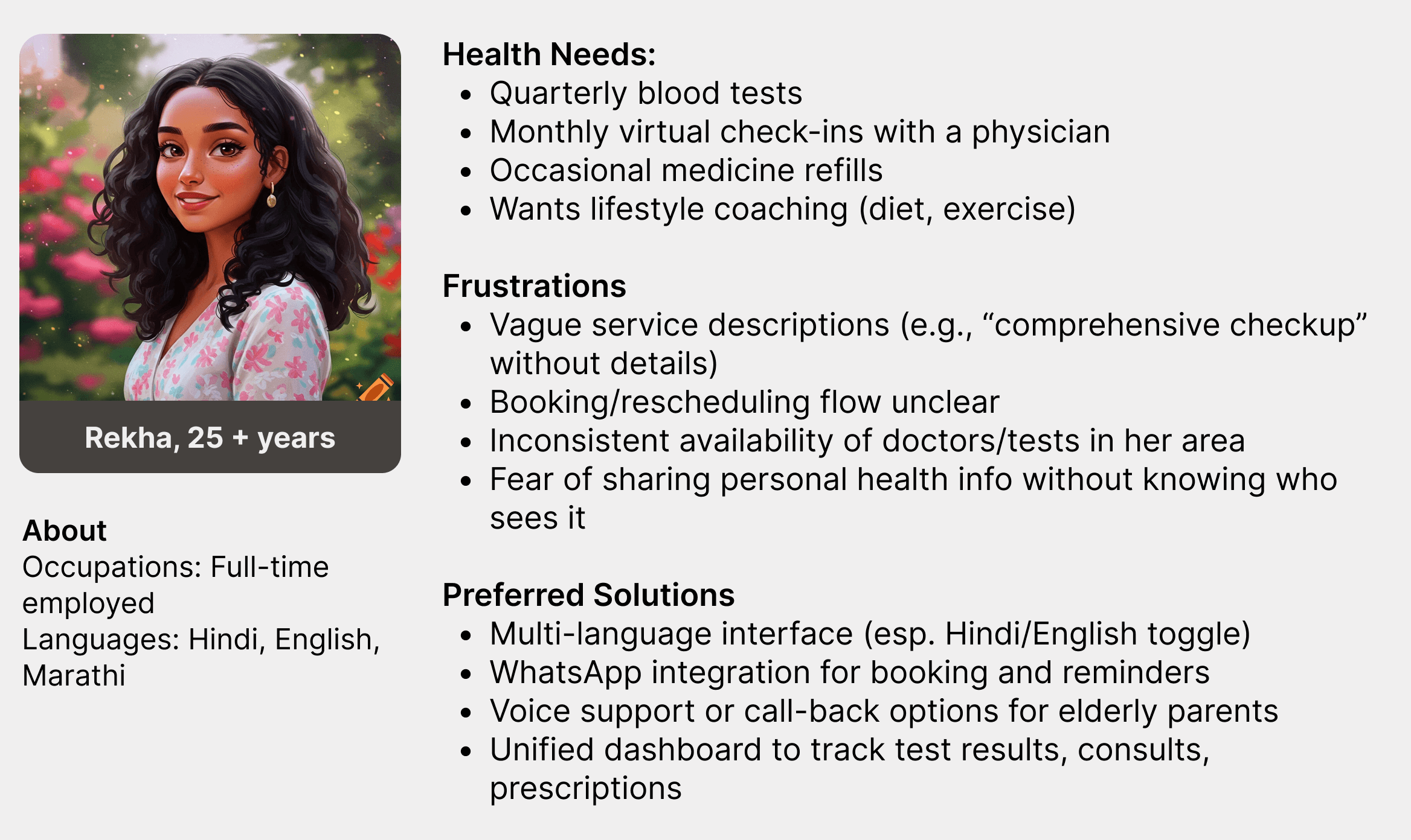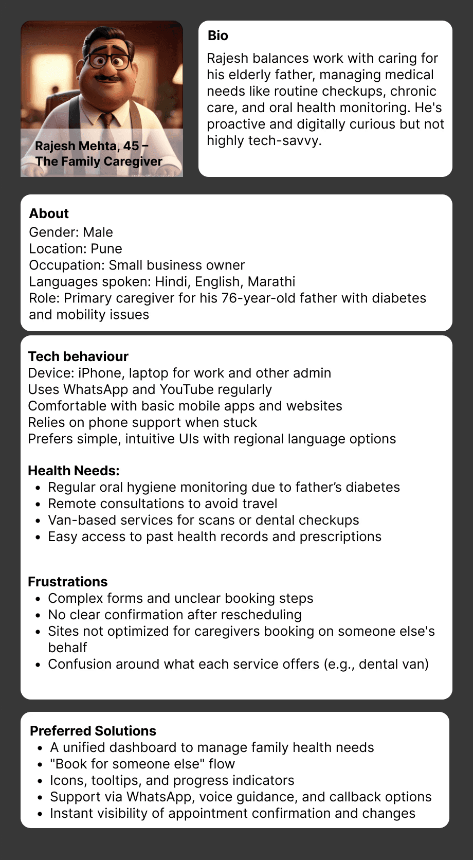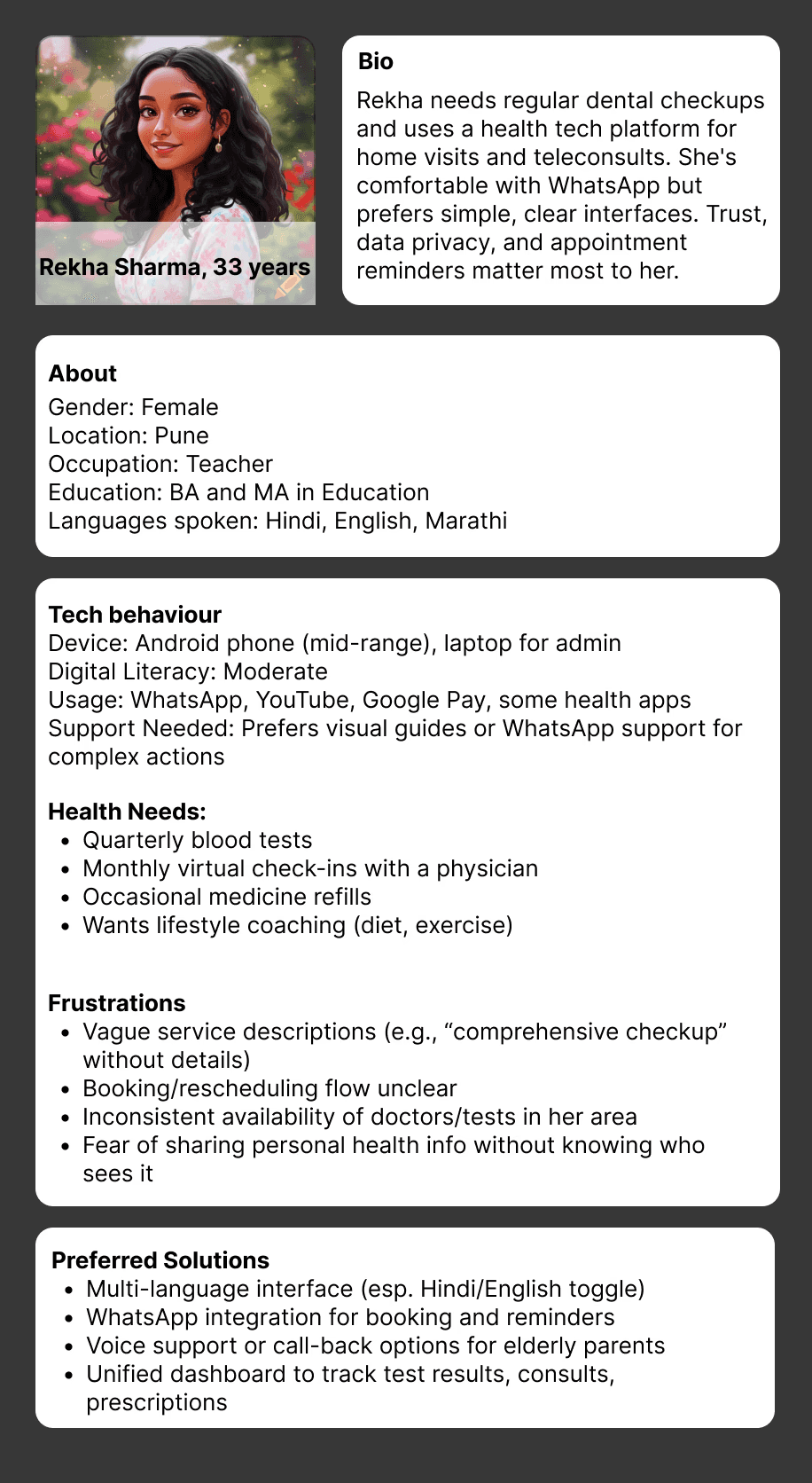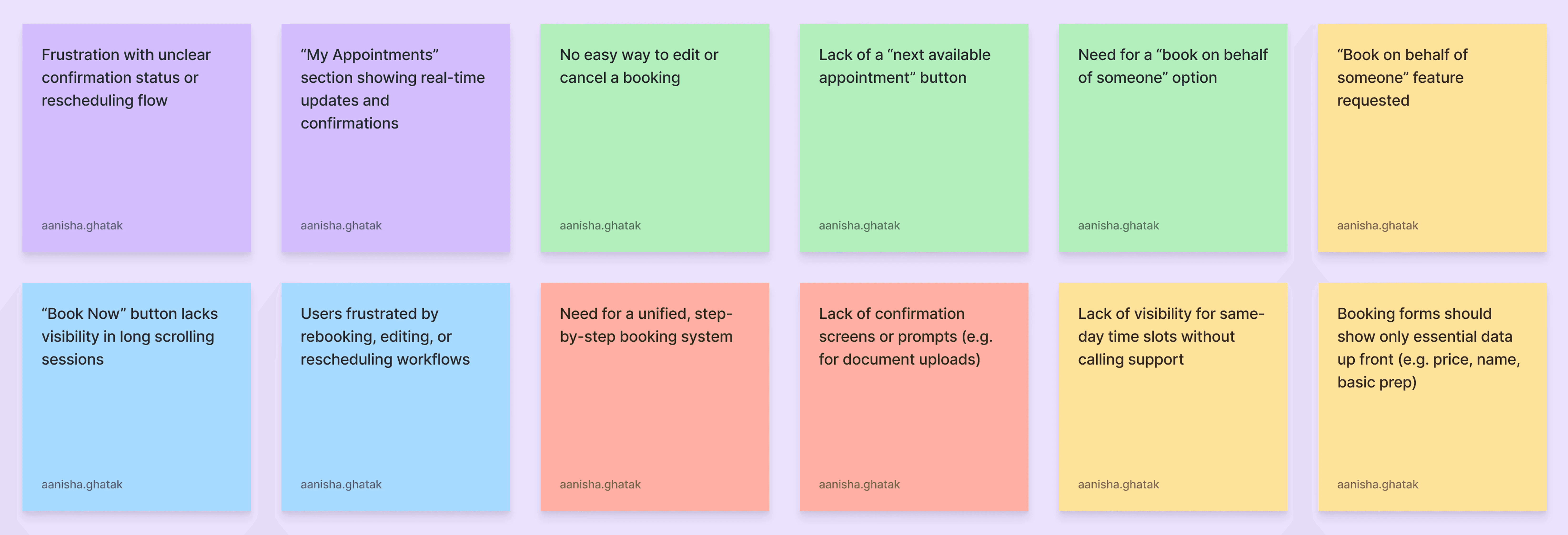 From a technical perspective, I noticed that booking edits, slot visibility, and confirmation processes could be improved. Telehealth usability was also a challenge, often due to tech gaps or unclear flows. Throughout, I relied on metrics like conversion, drop-off, and support queries to evaluate what was working and where improvements were needed.